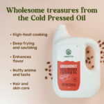 As seen in the images; this cold-pressed groundnut oil retains maximum natural nutrients and vitamins. The traditional method ensures it’s rich in antioxidants and good source of antioxidants; promoting heart health and overall wellness. It’s perfect for salads; dressings; low to medium heat cooking; and suitable for everyday cooking. The images also highlight the convenient packaging and the natural peanuts used in the process.