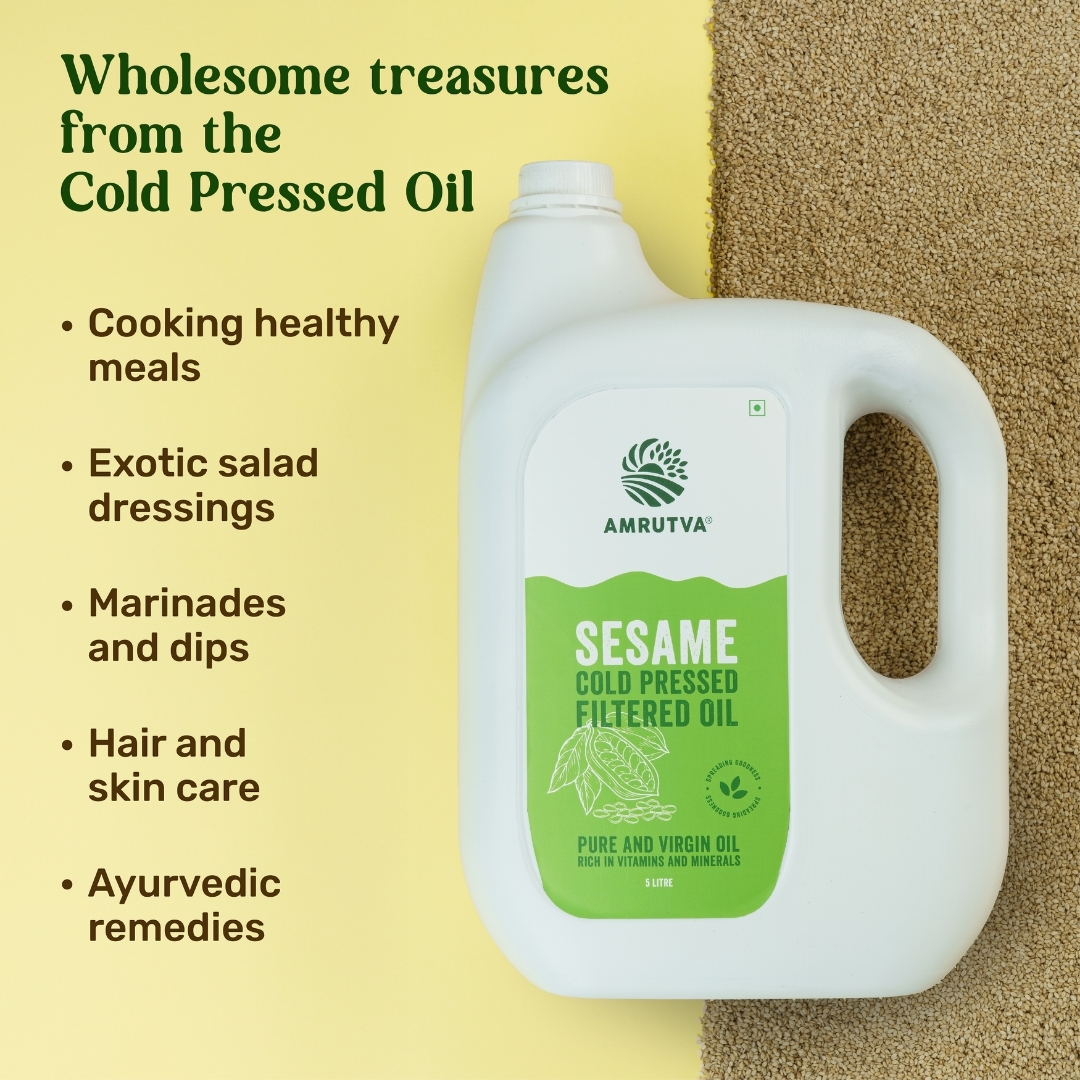 Amrutva’s extra virgin and cold-pressed sesame oil is extracted from premium quality Indian sesame seeds using traditional wooden kolhus/chekku at low temperatures. This natural; pure; and preservative-free oil preserves the seeds’ natural aroma; nutty flavor; and vital nutrients; making it ideal for daily consumption and a great example of cold pressed sesame oil for cooking. Sesamolin; naturally present in cold-pressed sesame oil; prevents further chemical reactions; thus increasing shelf life. This makes it one of the best cold pressed oils for cooking and a top choice amongst edible oils. It is truly the best cooking oil for you; offering a healthy and flavorful option for your culinary needs.